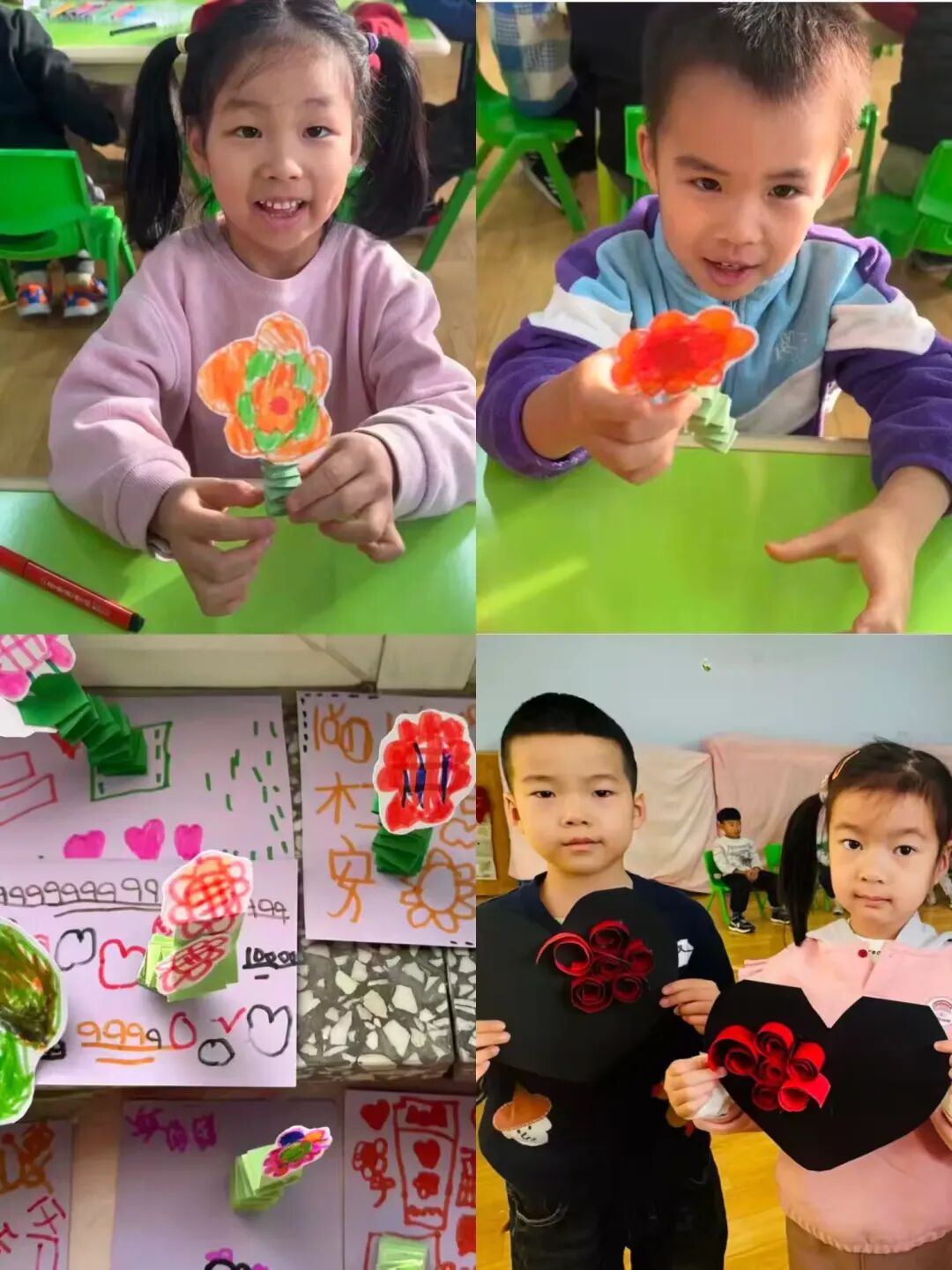 感恩贺卡:宝贝们在贺卡上画上爱心、写上“爸爸妈妈我爱你”,还有的用彩纸折成小花、卷成纸花装饰贺卡,每一张都是独一无二的心意卡。