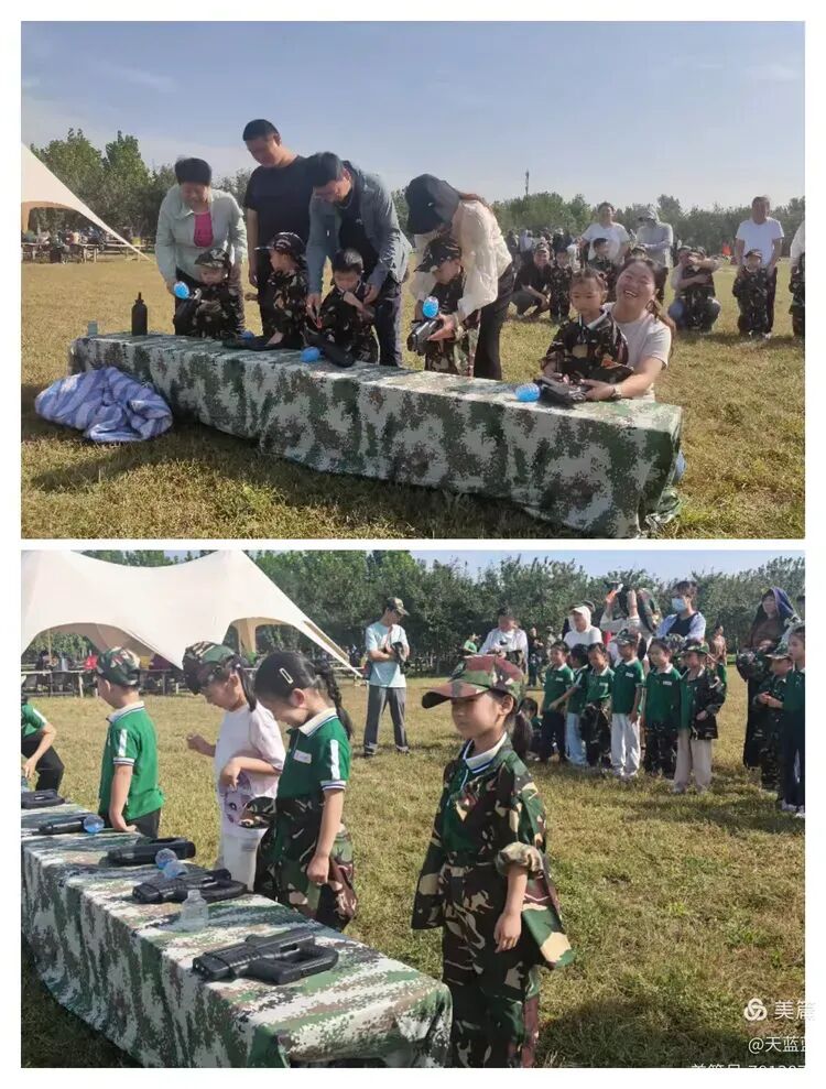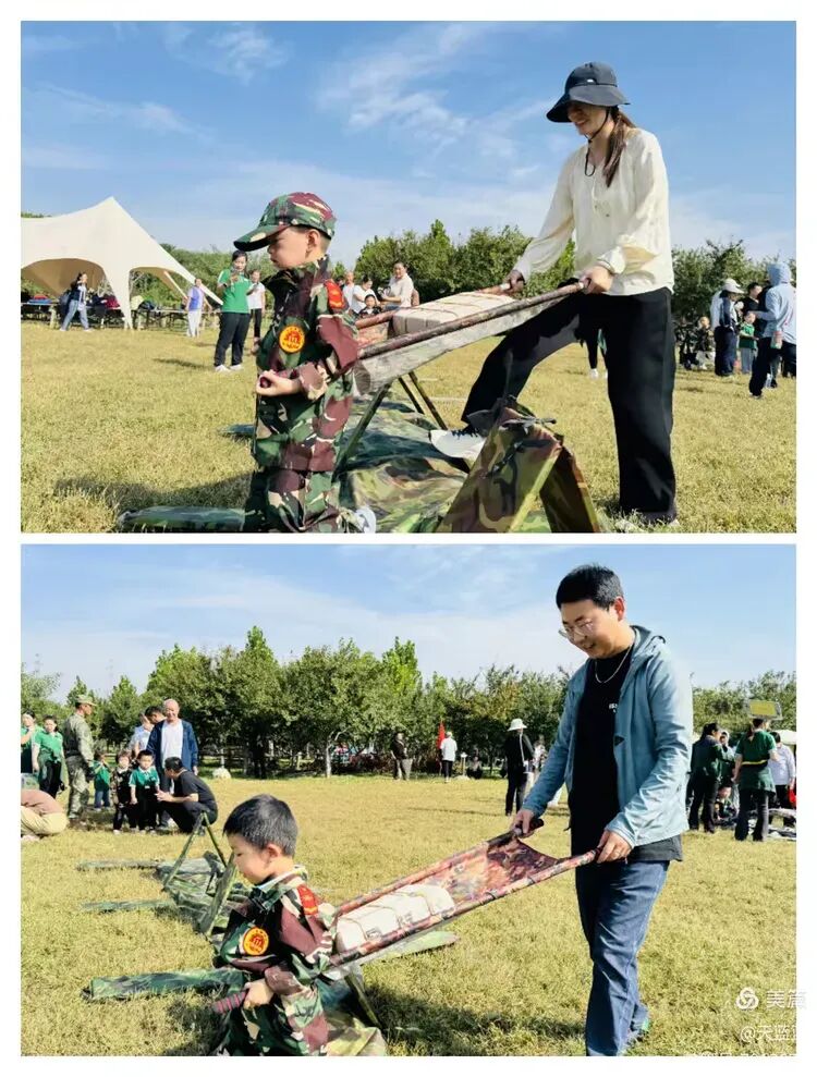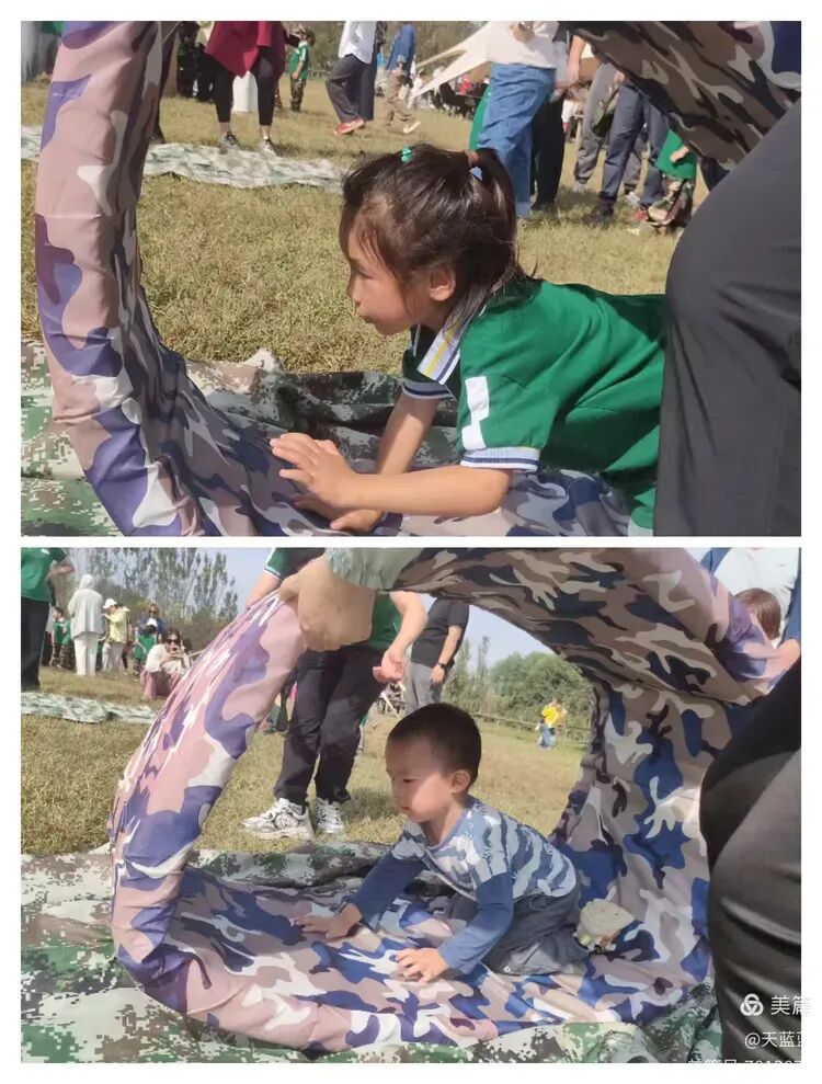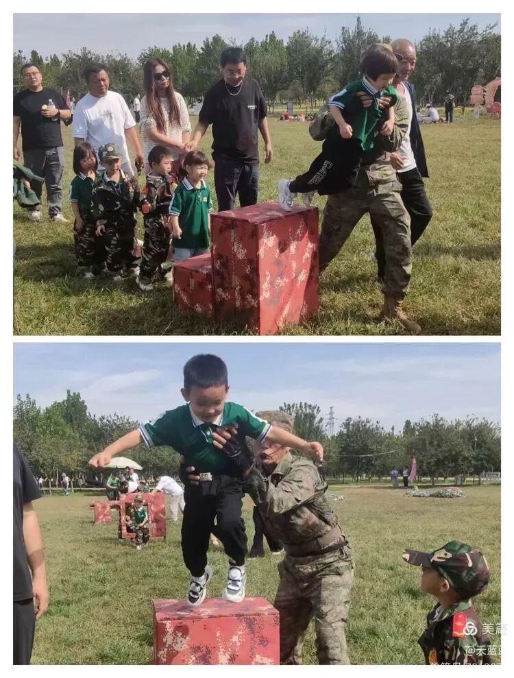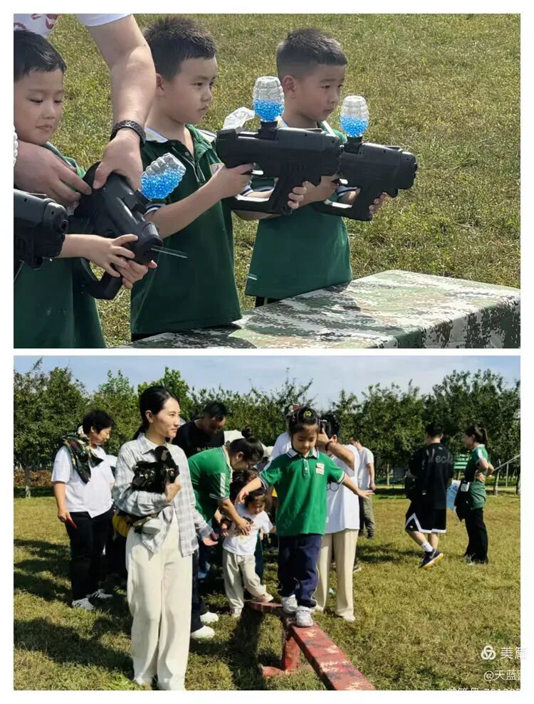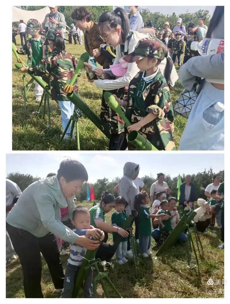 重头戏是“玩中学”的军事主题游戏。孩子们化身“小战士”,在家长协助下勇夺“神枪手”、参与“支援前线”、穿越“火箭发射区”、体验“排击炮发射”、推动“车轮滚滚”,挑战与欢笑交织,体能与协作并行,每一次并肩前行,都是亲子间信任与鼓励的无声流淌。
